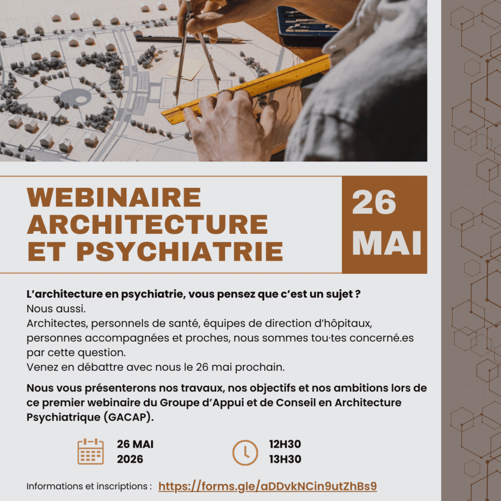 Nous participons depuis juillet 2025 aux travaux du Groupe d’Appui et de Conseil en Architecture Psychiatrique (GACAP). Le GACAP a vu le jour en novembre 2020 à l’initiative de la Conférence nationale des présidents de CME de CHSP et l’Union des Architectes Francophones en Santé (UAFS).