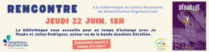 13H30 Accueil café 13H45 | Allocution d’ouverture Dr Martine Lefebvre, présidente du conseil d’administration, F2RSM Psy Stephan Martino, Directeur Général – sous réserve Dr Bruno Tournaire Bacchini, Président CME – sous réserve 13H55 | L’ergothérapeute et l’aide soignant face à la Résistance Sandra Birck Sandra – aide soignante et Cyrielle