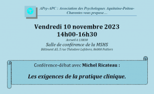 APsy-APC : Association des Psychologues Aquitaine-Poitou-Charentes vous propose… Cette année, nos observations, échanges et réflexions nous ont conduits à imaginer une conférence autour des enjeux et exigences de la pratique du clinicien. La demande institutionnelle s’affirme en « commande » contraignante, autour des notions d’efficacité, de réduction des symptômes, du