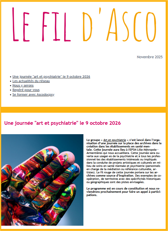 Le Fil d’Asco – Novembre 2025 | Journée art et psychiatrie, guide des archives hospitalières, réseau des archivistes,…